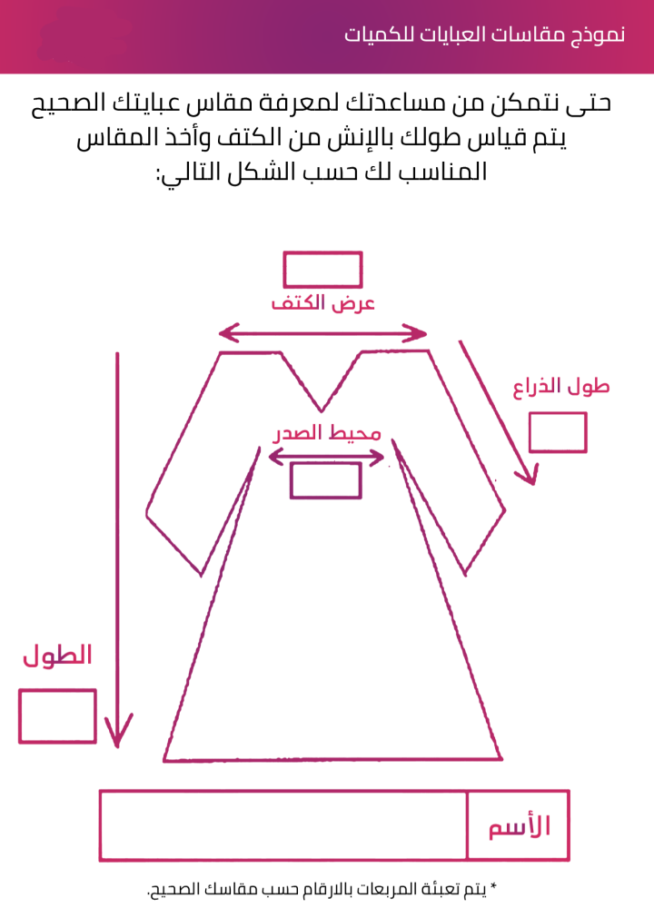 تفصيل حسب الطلب للمقاسات الغير موجودة في الجدول