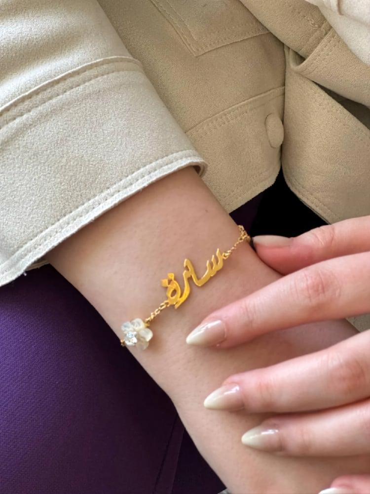 معصمك جمالاً. إمكانية كتابة الاسم او الحرف حسب طلبك، مطلية بالذهب عيار 21، وتتوفر بطلاء الفضة عيار 925، ضمان اللون سنتين من متجر لارين.