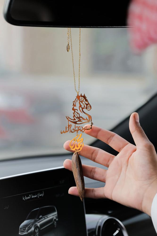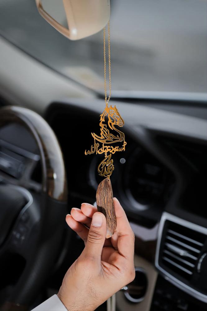تعليقة سيارة عود موروكي برسمة خيل بالاسم بتصميم أنيق واحترافي . تعليقة سيارة عود من لارين متوفرة باللونين الذهبي أو الفضي.